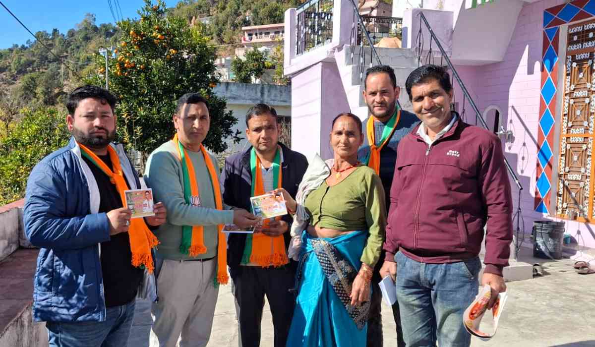 जिला मंत्री गजेंद्र खाती व युवा मोर्चा के मंडल अध्यक्ष शैलेन्द्र सिंह चौहान, वार्ड नम्बर एक सभासद प्रत्याशी हुकम सिंह, नरेंद्र सिंह चौहान, धर्मेन्द्र सिंह खाती, दिव्याशुं उनियाल ने भाजपा अध्यक्ष पद के प्रत्याशी राजेन्द्र सिंह खाती तथा सभासद प्रत्याशी हुकम सिंह व आशीष चौहान के लिए जन समर्थन मांगा, गजेंद्र खाती ने बताया कि मतदाताओं से अपील की गई कि भाजपा को मतदान करने से विकास कार्यों के लिए अधिक योजनाओं की स्वीकृति मिलेगी, उन्होंने लोगों को बताया कि कैबिनेट मंत्री सुबोध उनियाल के सहयोग से करोड़ों रुपये की पेयजल पम्पिंग योजना की स्वीकृति हुई है। साथ ही प्रदेश सरकार से अनेक महत्वपूर्ण योजनाओं के लिए तुरंत धनराशि मिली है यह तभी सम्भव है जब नगर पंचायत में भाजपा के अध्यक्ष व सभासद प्रत्याशी होंगे।इसी तरह वार्ड नम्बर तीन व चार मे भी कार्यकर्ताओं की टीम ने अध्यक्ष पर राजेन्द्र सिंह खाती व सभासद प्रत्याशी श्रीमती नेहा खाती एवं श्रीमती सीमा के पक्ष में मतदान करने के लिए जन समर्थन मांगा।इस अवसर पर भाजपा मंडल अध्यक्ष रतन सिंह रावत, उपाध्यक्ष ओम प्रकाश रुडोला, सोसल मीडिया प्रभारी विलेंदर सिंह असवाल, वरुण चौहान, महाबीर सिंह असवाल साथ मे रहे।